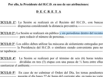 El cuestionado decreto que prohibe el ingreso a periodistas al recinto de sesionesA impulso de la mayoria oficialista, el Concejo Deliberante de Villa Gesell mantiene la prohibición de acceso a periodistas al reciento se sesiones, según un decreto firmado el años pasado por la entonces presidente Marta Zuloaga. En el día del Periodista, desde el Bloque de...