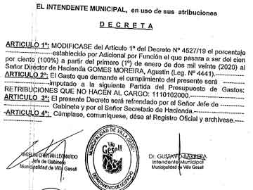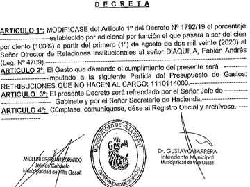 El decreto dupliando sueldo. Cambiemos pide explicacionesEn medio de la Pandemia, con los sueldos de los empleados municipales y los jubilados congelados,el intendente Gustavo Barrera firmó el decreto 1672/20, por el cual se otorgó al . Director de Relaciones Institucionales un incremento del 100 % a partir del 1 de agosto de 2020.<...