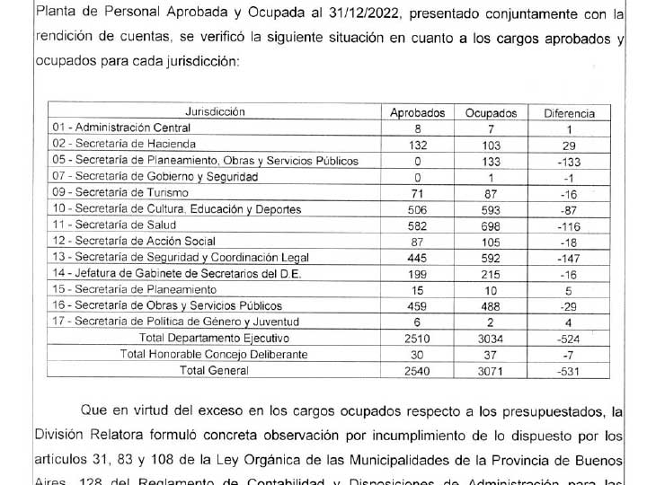 Las ineficiencias del manejo del personal llevan a otro dato llamativo: áreas enteras como las Secretarias de Planeamiento, de Gobierno y de Acción Social no tuvieron personal presupuestado, pero si ejecutado. Otro ejemplo fue el propio Concejo Deliberante: de los 30 cargos aprobados terminó pagando por 37, lo que no se explica ni siquiera por las divisiones de los Bloques Pro que sumaron un secretario más, ni la aparición del bloque de la Libertad Avanza de Luis Vivas, mas un fotógrafo sumado por la presidencia del Concejo y al servicio del Frente de Todos. Aun así, faltan cargos.